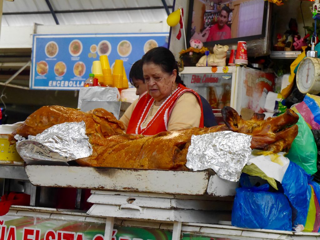 A l’étage, zone des almuerzos, on trouve le fameux hornado de Cuenca: un porc entier, braisé, à la chair tendre et la couenne croquante pour 3 USD. Un classique de la ville et un régal !